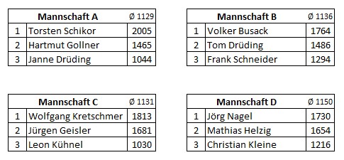 Wir spielen daher wie im letzten Jahr mit vier Mannschaften doppelrundig gegeneinander, allerdings besteht jede Mannschaft diesmal nur aus drei Spielern. Die erstgenannte Mannschaft in der jeweiligen Runde hat an allen drei Brettern Weiß.